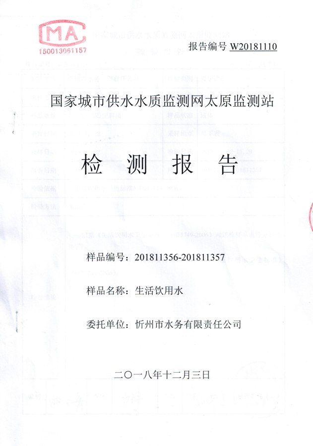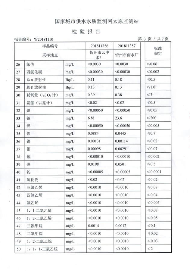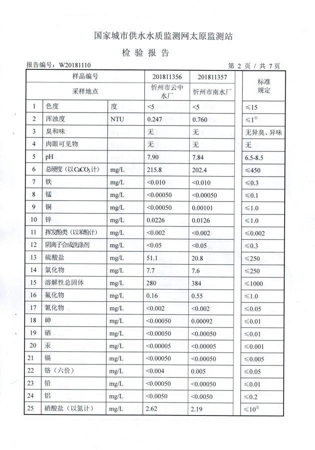 2018年忻州城區(qū)公共供水南水廠、云中水廠出廠水106項水質(zhì)全分析信息公示